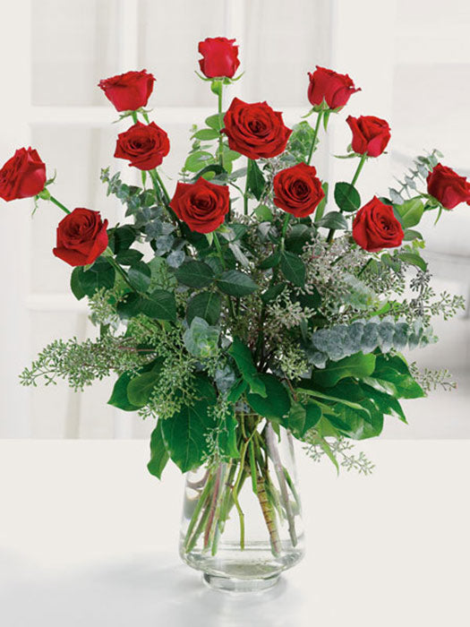A dozen red roses are always perfect, always savored. We add even more charming beauty with seeded eucalyptus, spiral eucalyptus and salal. Deluxe includes 15 Roses, Premium includes 18 roses and WOW will come with 2 Dozen roses!
