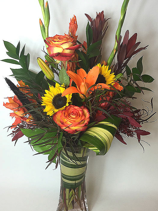 Gorgeous bouquet showcasing the rustic colors of autumn in all their glory. Orange lilies, bi-color roses, gladiolas, and golden sunflowers are gathered together with burgundy proteas, seeded eucalyptus and lots of seasonal foliage. A beautiful presentation of fall color.