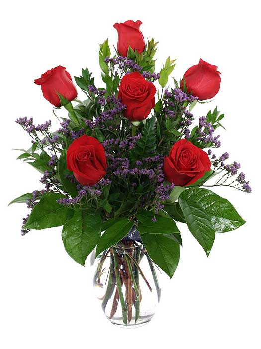 Six red roses arranged with pretty purple limonium and lots of fresh greenery to make a full bouquet that won't break the budget. Deluxe includes 9 Roses, Premium includes 1 dozen roses and WOW will come with 18 roses!