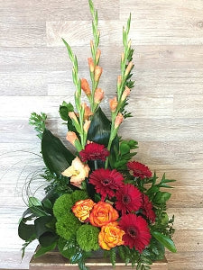 A simple yet striking design of tall gladiolas, anchored with gerbera daisies, roses, and varied green foliage.