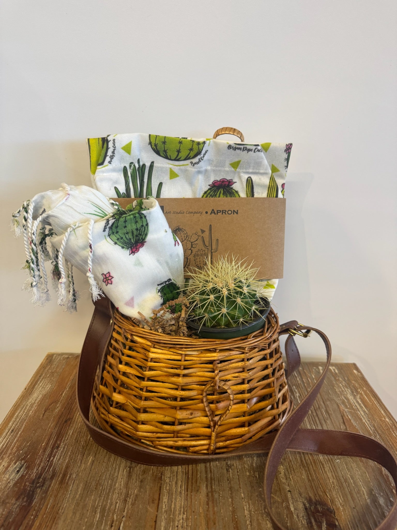 Bring the desert’s quiet beauty into everyday life with this curated cactus-themed gift set. Thoughtfully arranged in a rustic wicker handbag with a supple brown leather strap. Includes a lively and low-maintenance mini potted cactus, accompanied by a soft cotton apron and dish towel, featuring playful cactus prints.