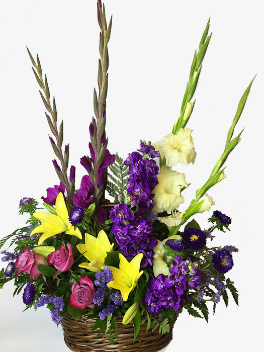 A celebration of life's memories and inspiring peaceful moments like walking in a beautiful garden. Spring-like color with gladiolus, stock, roses and lilies.