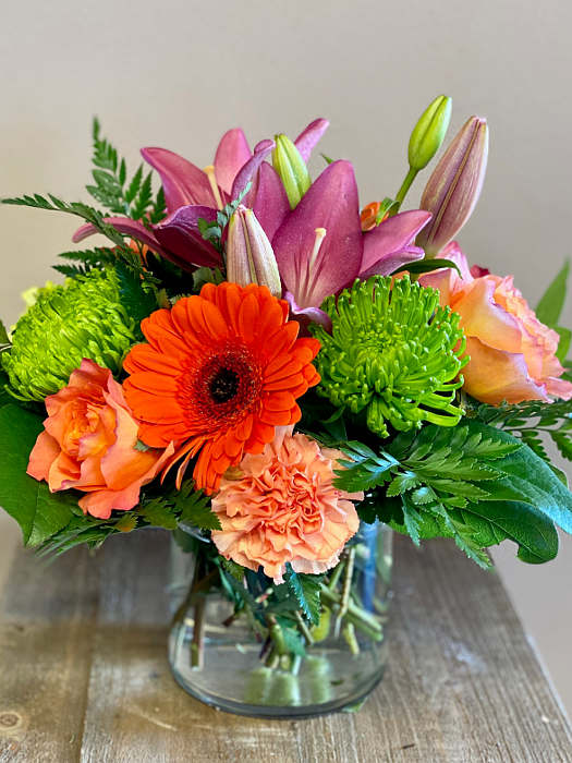 Bright, happy, fresh and lovely. A lush low profile bouquet of brilliant blooms in bright colors. Gerbera Daisy, hot pink carnation, lime green mums and so much more.