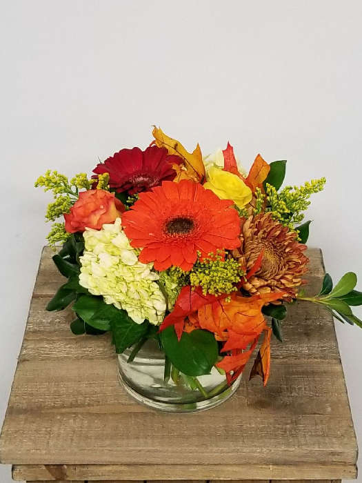 Glass vase filled with freish flowers representing a variety of fall colors. This arrangement is perfect for any fall celebration, including birthdays or Thanksgiving.