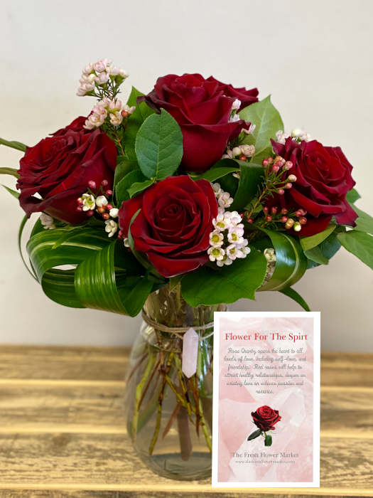 Flower for the Spirit will speak to the spirit of the recipient. Bouquet of red roses comes with a card explaining the significance of the red rose and the rose Quartz gemstone attached to the vase.