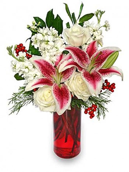 Fabulous and fragrant Christmas bouquet of Stargazer lilies, white stock and white roses. Accents of evergreen and red berries makes this bouquet a perfect hit for the holidays.