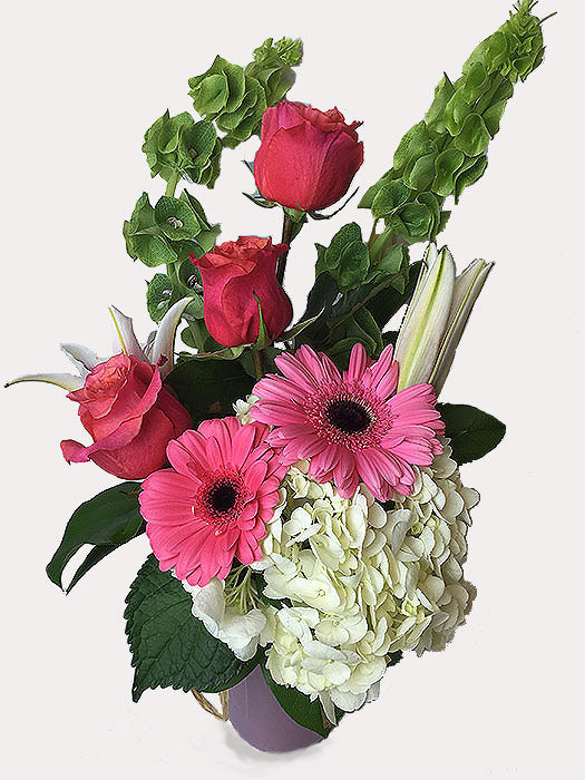A wondrous mix of stunning favorites all in one bouquet. Hydrangea, roses, lilies and bells of Ireland.