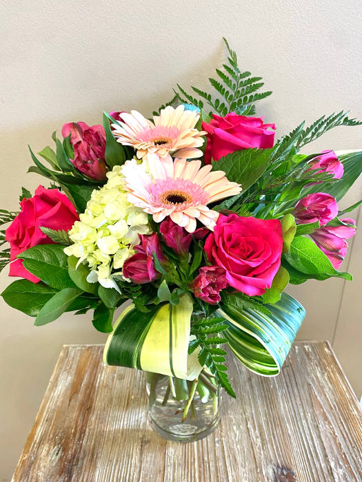Delight someone special, with pink roses, pink gerbera daisies, and pink alstromeria.