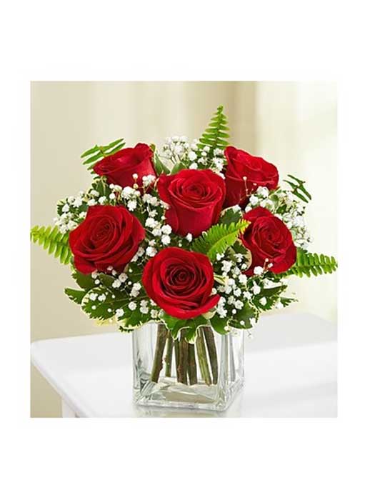 Six beautiful red roses perfectly arranged in a low glass cube. Perfect size for desk or tabletop.