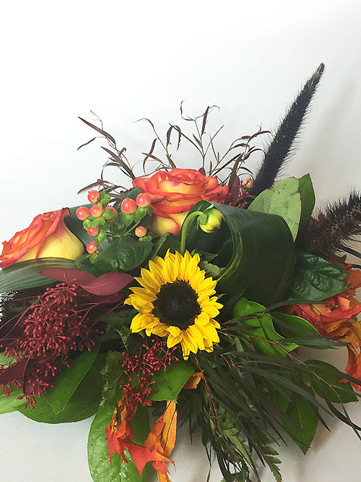 Perfect for table, counter, or mantle this gathering of seasonal elements will complement your fall decor. Featuring bi-color roses and sunflowers paired with berries, fall foliage and cattails this low and lush arrangement makes a seasonal statement.