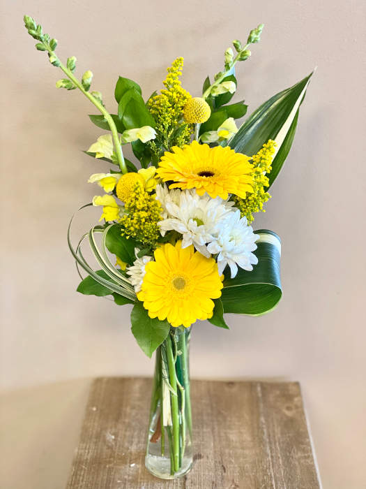 A pretty bouquet of yellow and white that welcomes that springtime feeling. Daisies and snapdragons are artfully surrounded by greenery.