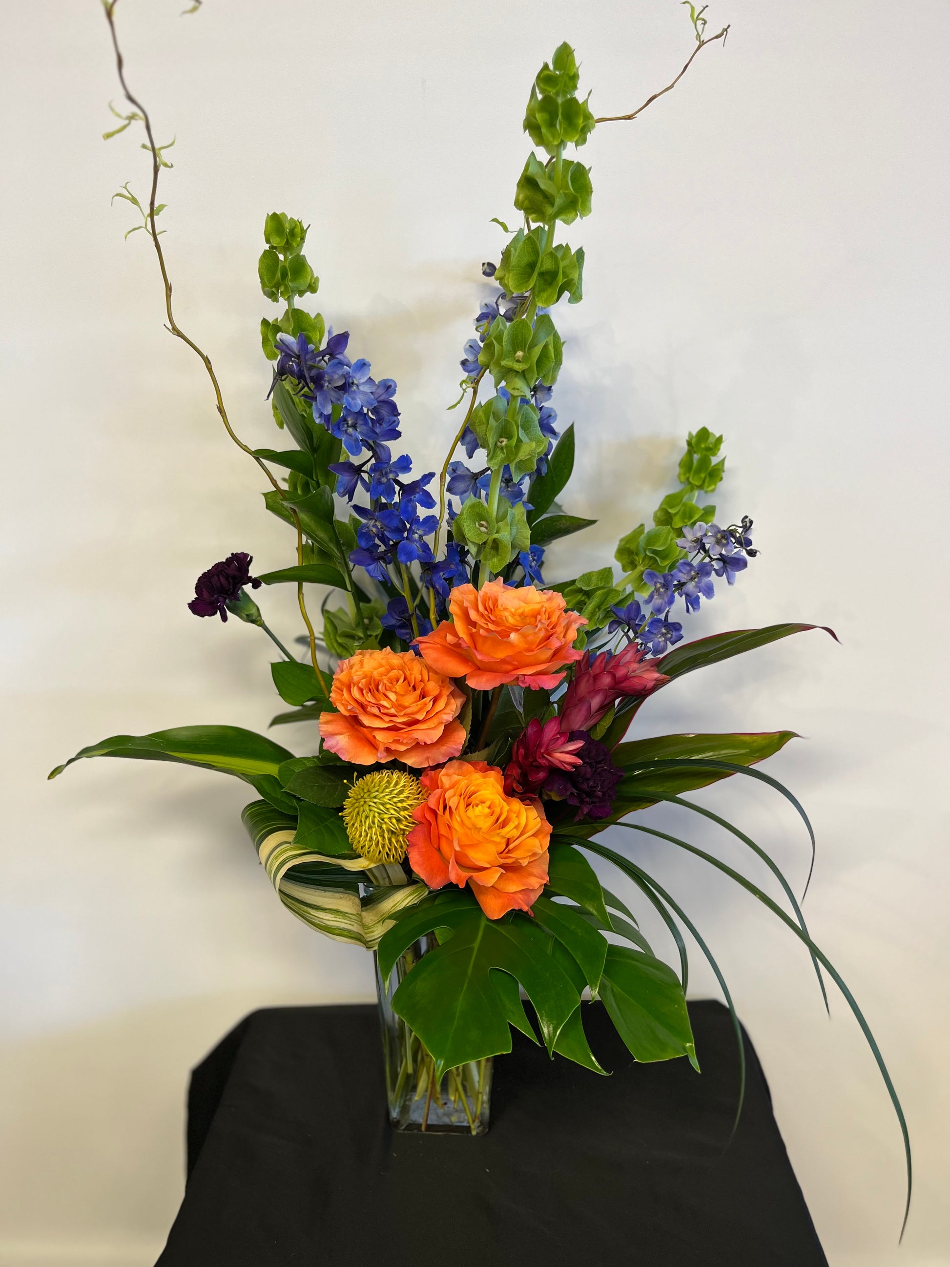A vibrant floral arrangement harmonizing lush greens, serene blues, and delicate peach hues, capturing the essence of the season's renewal in one captivating display.