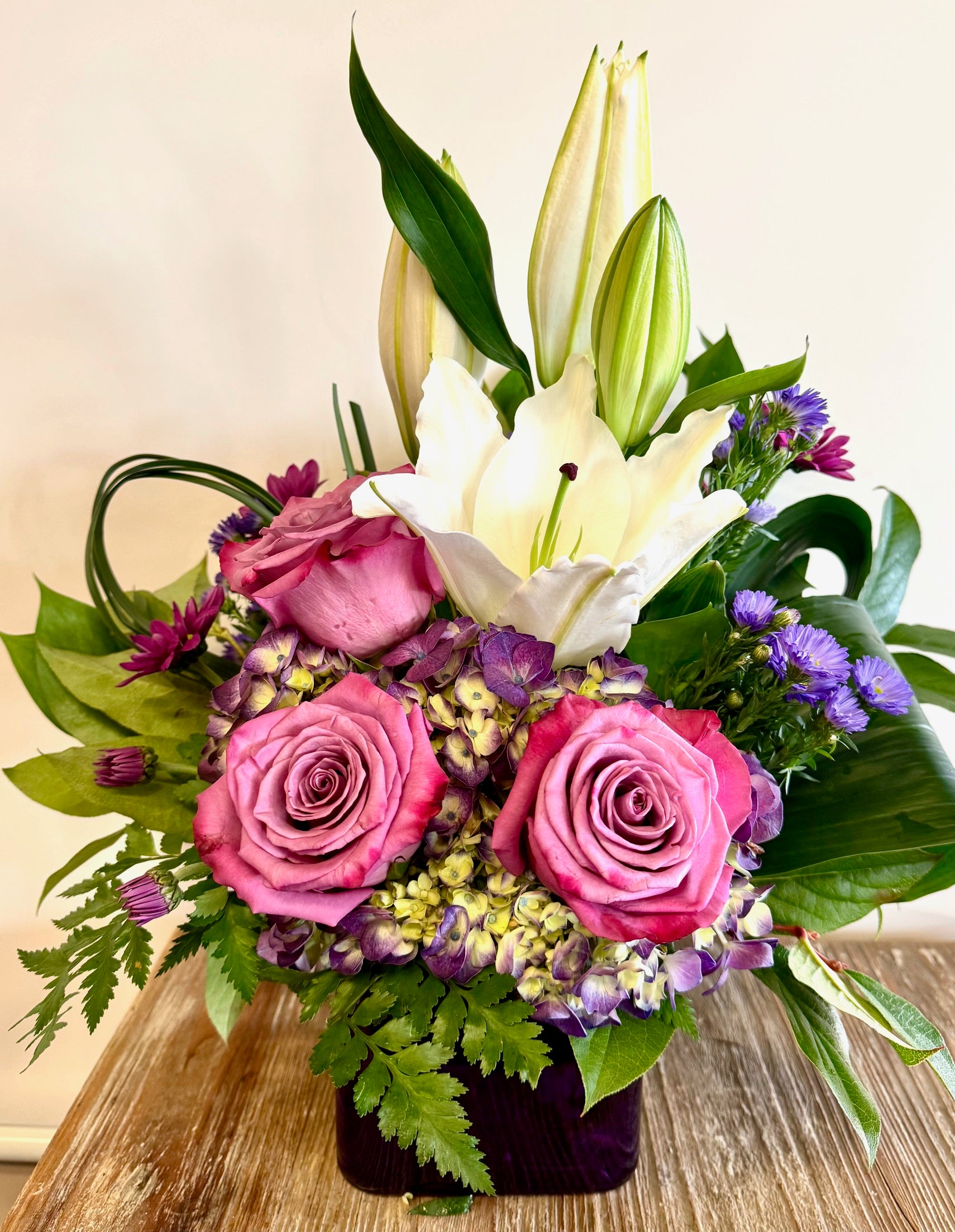 A soft, romantic mix of lavender roses, white lilies, and purple blooms, gathered with lush greenery and set in a deep plum vase. A graceful, heartfelt arrangement perfect for celebrating love, gratitude, or life’s tender moments.