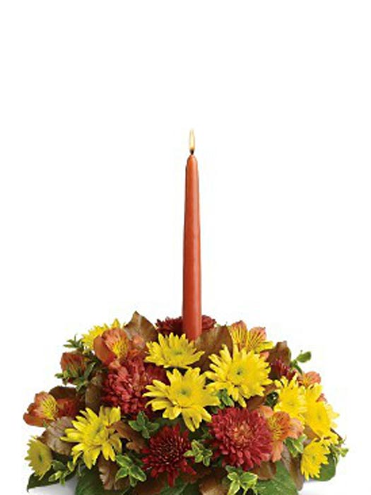 A traditional centerpiece with fresh flowers in fall colors. This is a smaller size perfect for smaller table or apartment, but still sets the mood and adds a welcoming glow to your holiday table. 1 taper candle included.